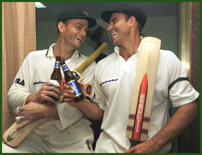 Adam Gilchrist (left) and Matthew Hayden of Australia celebrate their centuries.