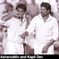 Returning Kapil Dev's compliment describing him as a 'gem of a cricketer,' Azharuddin said of the Wisden award, "I think Kapil Dev deserved it more than anyone else. I think he has played on very flat wickets and to get to that 430 mark and one time world record holder – and then 5,000 runs -- a brilliant fielder, good runner between the wickets, I think it is very appropriate. "He also has tremendous fitness and never missed a game." Azharuddin said many of his cricketing colleagues have kept in touch with him, although he let slip that does not include members of the present Test side. "A lot of people have kept in touch with me, maybe not from the present team, but I have a lot of well wishers like Kapil." "I speak to a lot of players, they call me on and off. But during the difficult time I hardly had anyone talking to me. "It sounds sweet when after a long time people talk good about you, especially when you have done a lot for the country and played with distinction. It's good, it's a good feeling." Supremely pragmatic, he says he does not miss being part of the team " because I have to live with what happened. But definitely I still had three or four years to go. I was still fit and scoring runs, but anyway hopefully things will change." "Mentally, I am very strong, physically I am very strong. I think that keeps me going, that keeps me strong all the time." He refused to discuss members of the current Indian team, saying it was uncalled for him to comment on individual players, including those he has played with in the past. Asked to comment on media reports that his professional troubles have affected his marriage, he replied, "That's all rubbish. Whoever is doing that or saying that they must be having the problems. Must be affecting them, not me." Azharuddin was optimistic about the company he started, Events, although he admitted the market was a bit low. "Hopefully it will pick up. It can do anything like fashions shows, concerts, we've done a couple of shows." He was also upbeat about the cricketing prospects of his young sons, Asad, 12, and Ayaz, 10. "They are both good all round players. I don't want to put any pressure on them, if they are good, they will play."