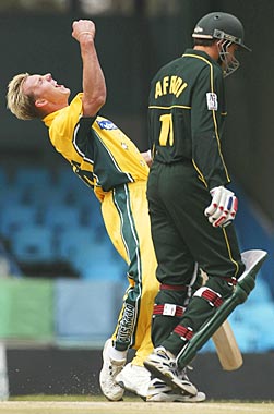 Brett Lee pumps the air after claiming the wicket of Shahid Afridi, caught by Ricky Ponting for a duck.