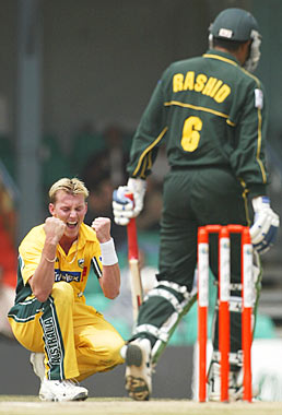 Lee rejoices again as Rashid Latif is caught by Damien Martyn off his bowling, for 12.