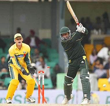 Abdur Razzaq is bowled by Shane Warne for a duck as Adam Gilchrist looks on.