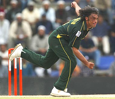 Pakistan fast bowler Shoaib Akhtar sends down a delivery during the match.
