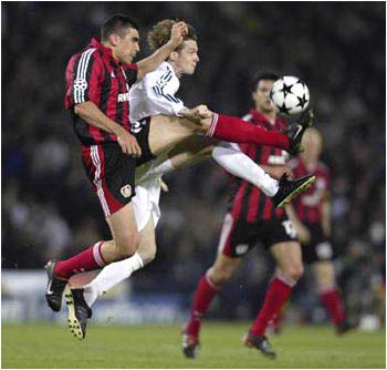Bayer Leverkusen defender Lucio attempts to prevent Steve McManaman of Real Madrid from breaking through.